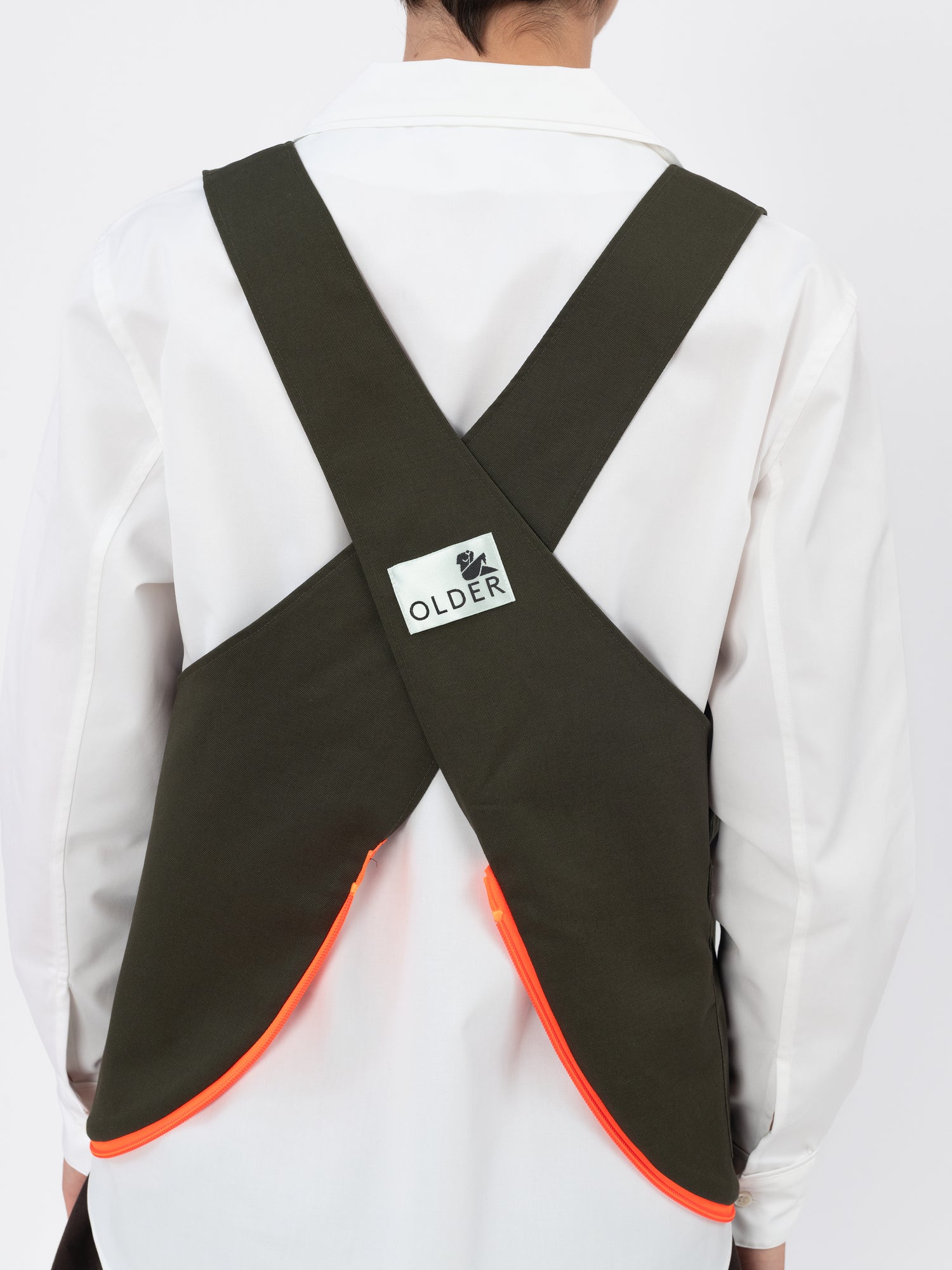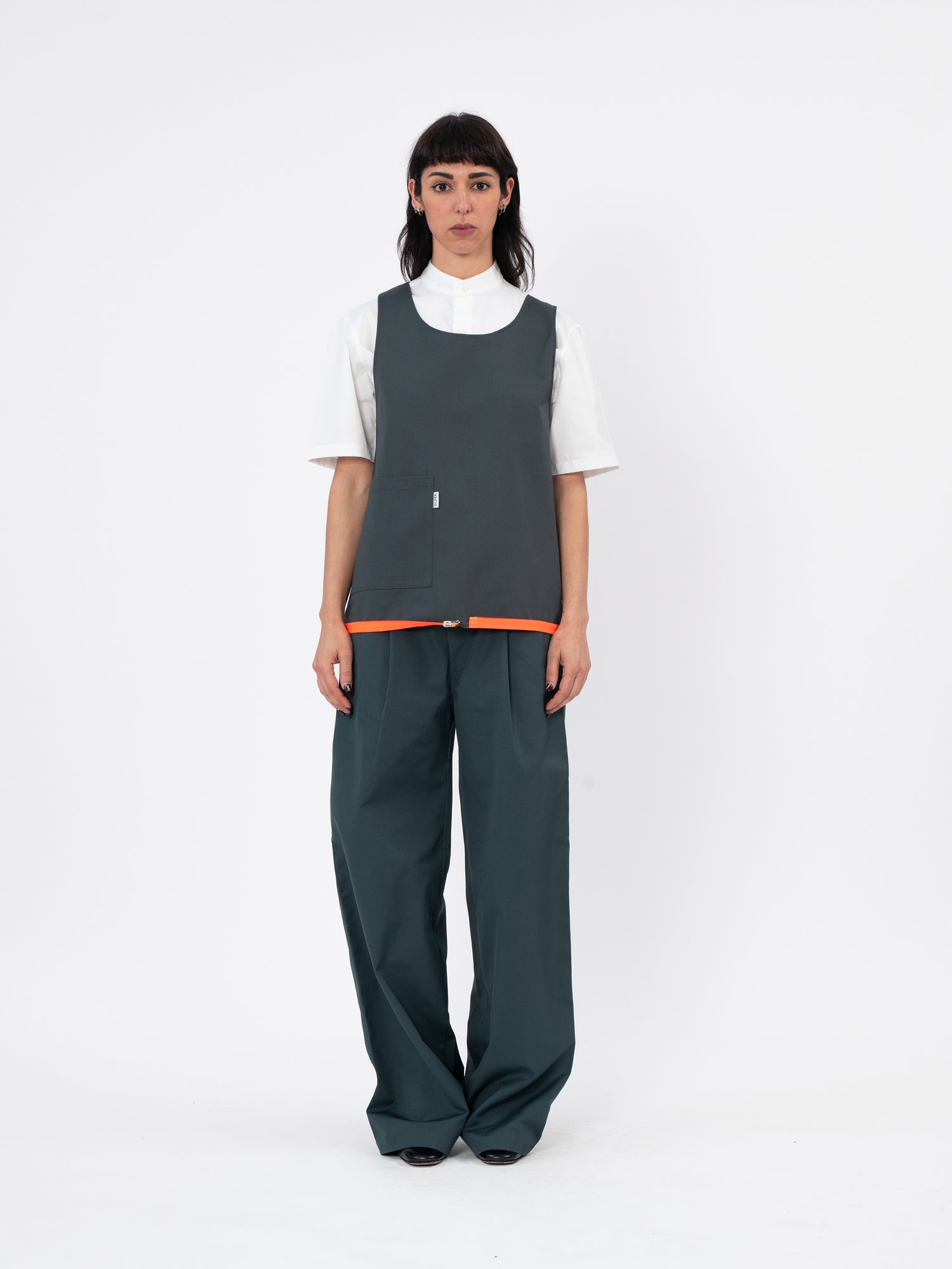 The apron-gilet can be easily fastened and readapted to become a shoulder bag through a contrasting color zip at the bottom hem.